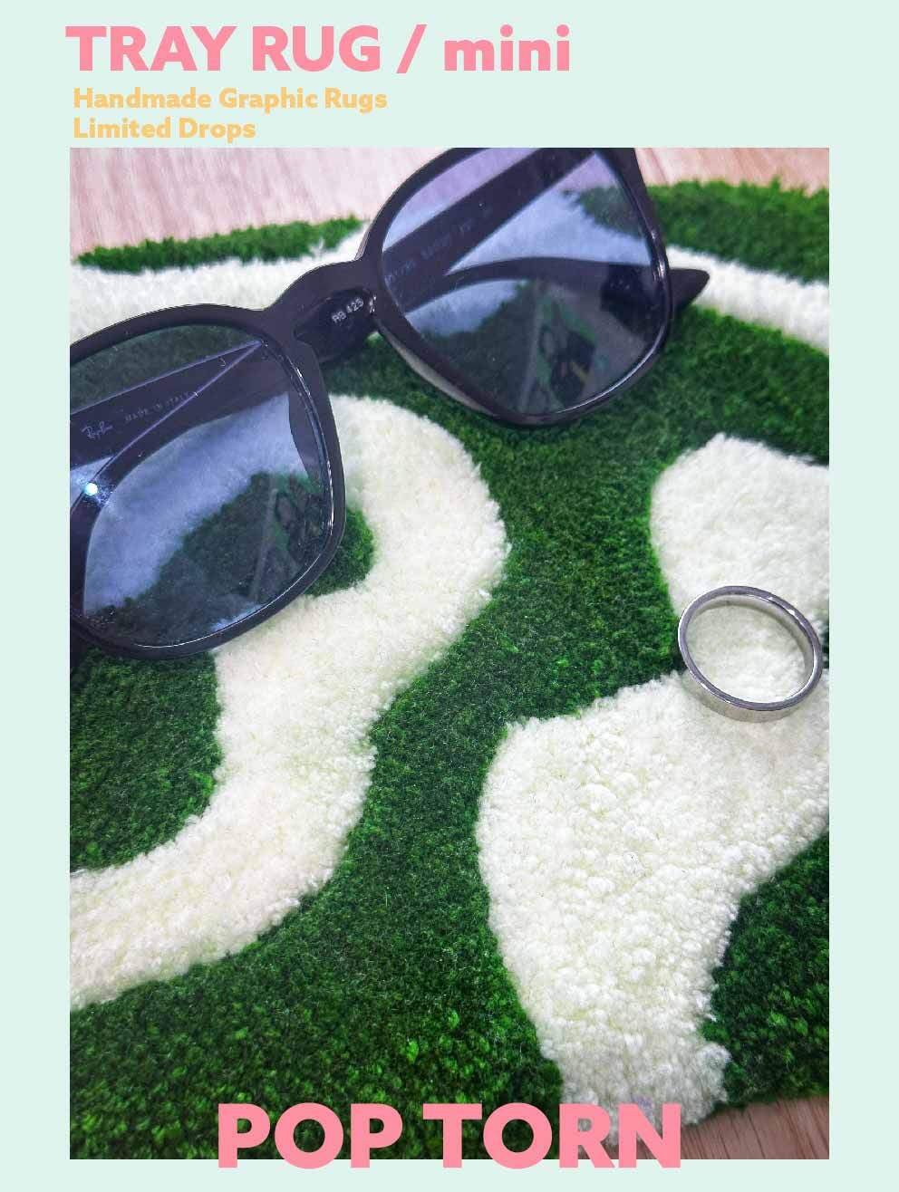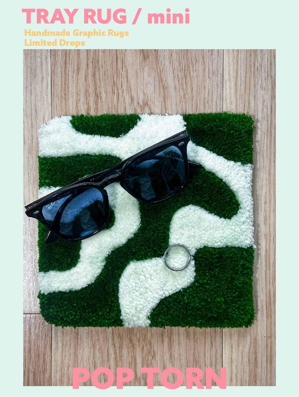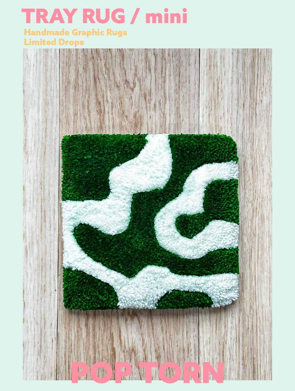 抹茶ラテをこぼしたような、有機的で遊び心のある曲線が特徴のミニラグ。