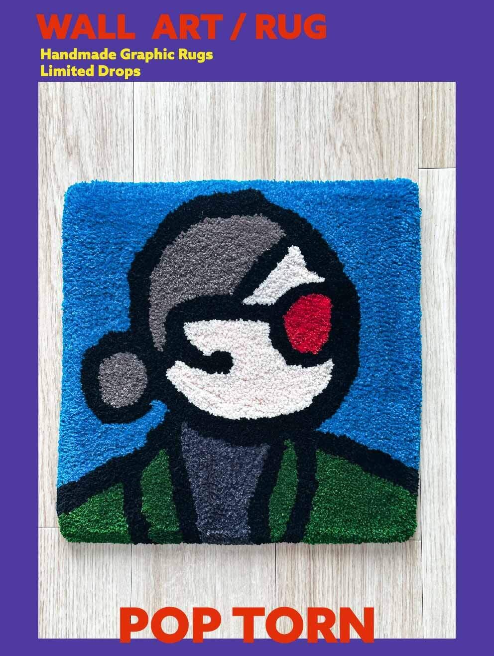 Handmade Graphic Rug - "Urban Lady" 都会的な大人の女性を独自の視点で捉え、大胆なフラットデザインとポップな色彩でキャラクター化。印象的なブルーの背景に、クールなモノトーンと情熱的な赤のアクセントが映える、インテリアの主役になる一枚です。